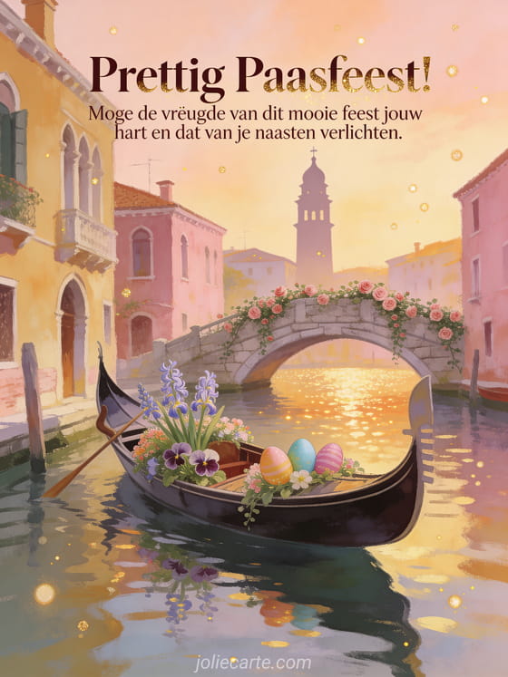 Stuur een mooie tekst om een prettig paasfeest te wensen met een romantische Venetiaanse sfeer bij zonsondergang. Bekijk ook prettig paasfeest in afbeeldingen, een vrolijk paasfeest tekst of een tekst van vrolijk pasen.