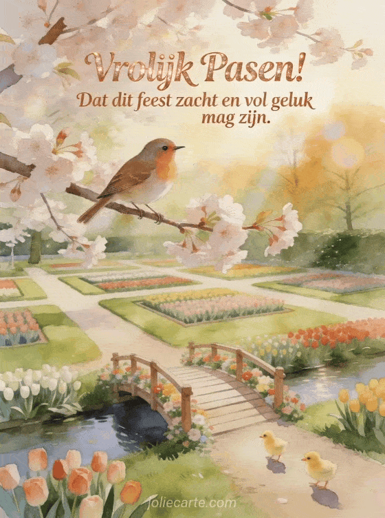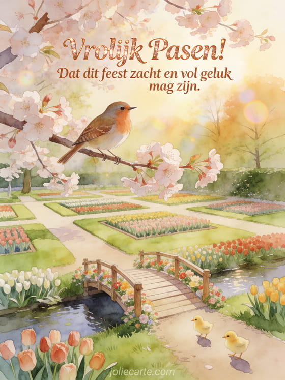 Stuur een poëtische paaskaart met een nachtegaal gezeten op een bloeiende kersentak met uitzicht op de Keukenhof bloemenpaden, onberispelijke grasvelden met geometrische tulpenbedden en een kleine houten brug over een met bloemen omzoomde beek. Ontdek ook een kaart prettig paasfeest of een gratis paaskaarten.