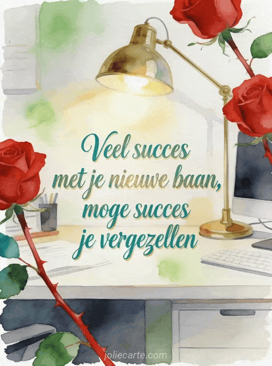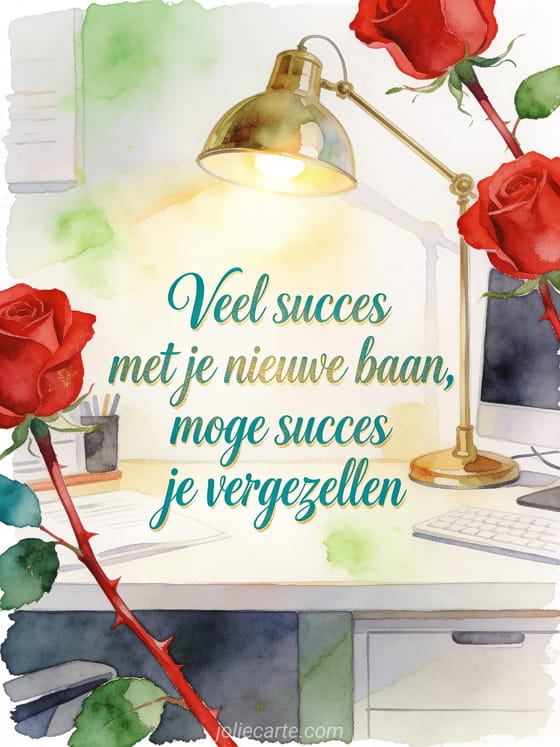 Wens iemand veel succes met een nieuwe baan via een elegante aquarelscène met een brandende bureaulamp en rode rozen. Je kunt ook een veel succes bericht, een dag en veel succes tekst of een bericht veel succes collega delen.