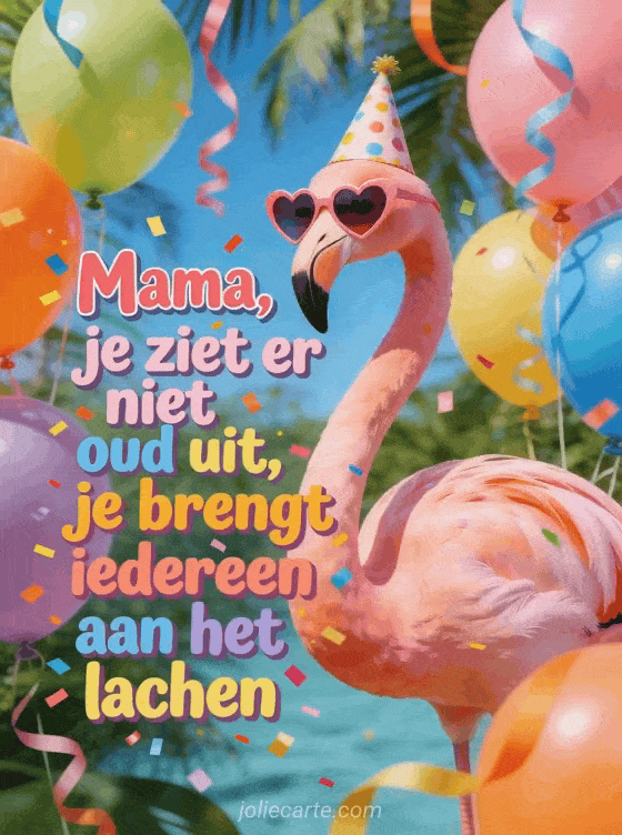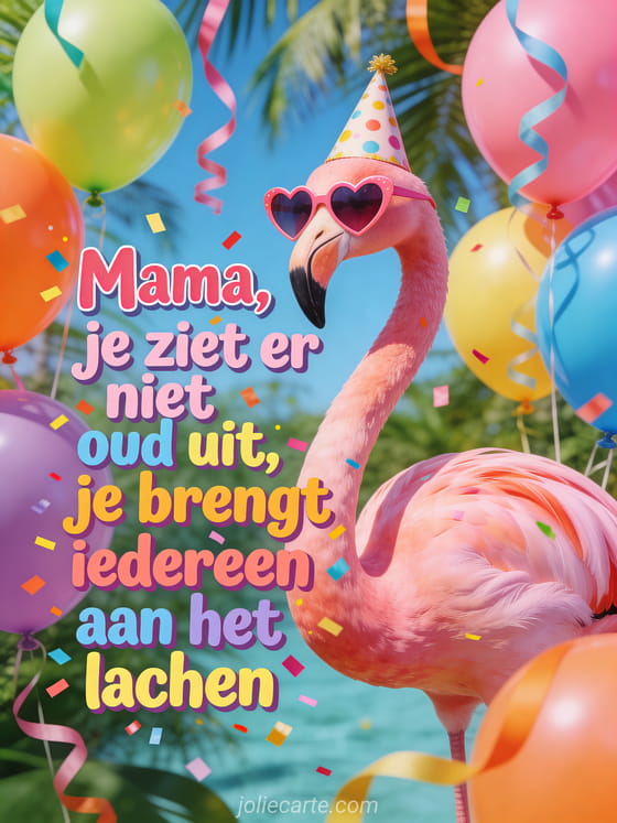 Stuur mama een grappige verjaardagskaart met de tekst dat ze niet oud uitziet en iedereen aan het lachen brengt, met een flamingo in een feestmuts. Bekijk ook gefeliciteerd gefeliciteerd mama of gefeliciteerd mama ik hou van je.