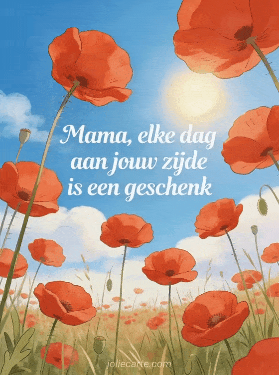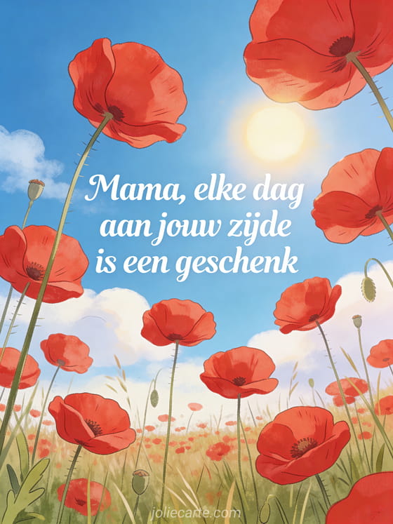 Stuur mama een vrolijke verjaardagskaart met de lieve tekst dat elke dag aan haar zijde een geschenk is, met een prachtig klaprozen veld. Bekijk ook verjaardag mama of gefeliciteerd mama.