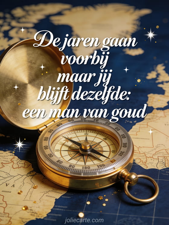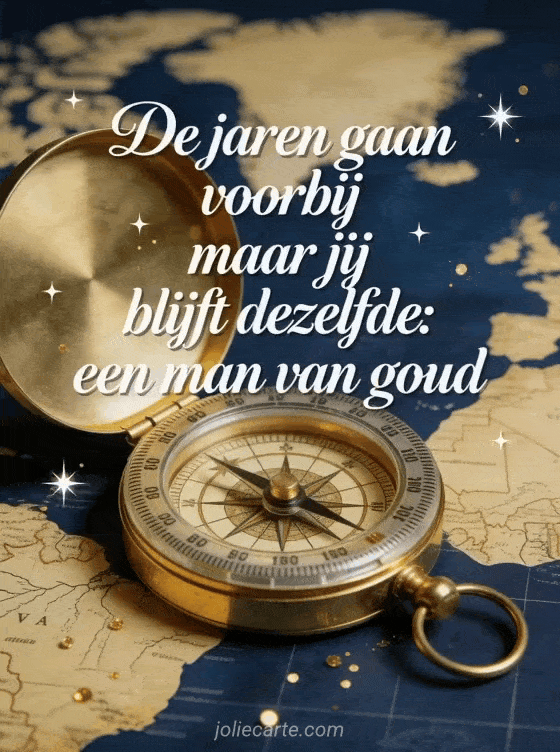 Een oud gouden kompas op een vintage wereldkaart met glinsterende sterren en gouden deeltjes op een nachtblauwe achtergrond. Bekijk ook afbeeldingen gefeliciteerd verjaardag man of gif gefeliciteerd verjaardag man.