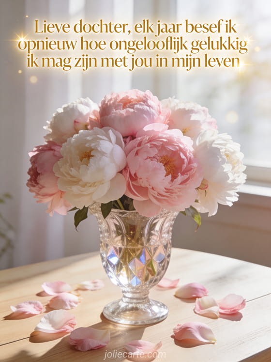 Vertel je volwassen dochter hoe gelukkig je met haar bent op haar verjaardag. Een luxueus boeket roze en witte pioenrozen in een kristallen vaas, met losse blaadjes op een licht houten tafel in zacht ochtendlicht — teder en verfijnd.