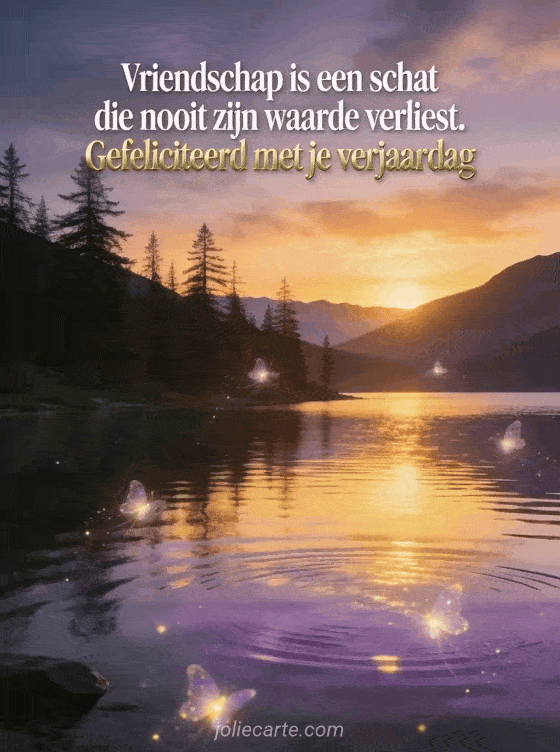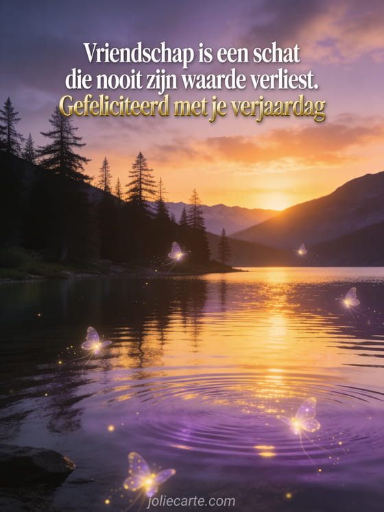 Een fotorealistisch bergmeer bij zonsondergang met gouden en paarse weerspiegelingen, silhouetten van sparren en lichtgevende vuurvliegjes. Bekijk ook gefeliciteerd vriendschappelijk verjaardag of bericht verjaardag beste vriendin.