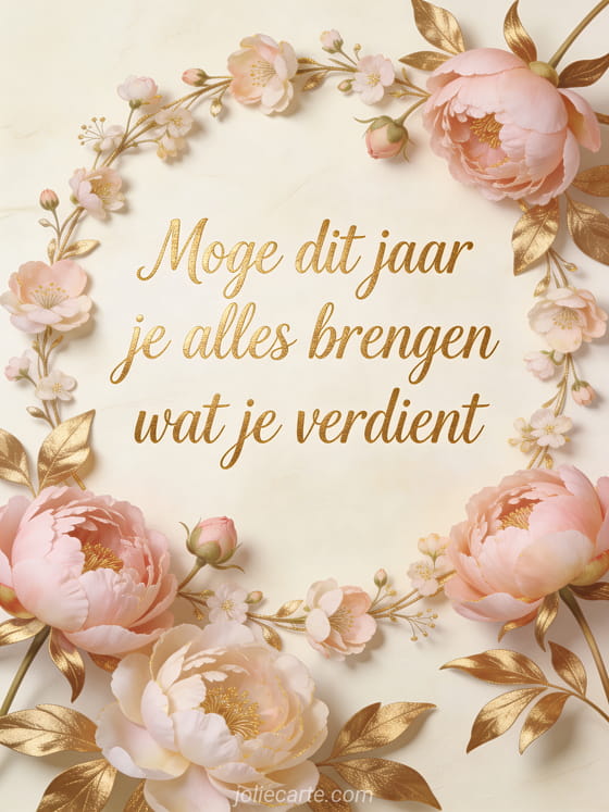 Elegante gouden handgeschreven letters omgeven door een krans van lichtroze pioenrozen en gouden bladeren op een getextureerde crèmekleurige achtergrond. Bekijk ook gratis afbeelding verjaardag vrouw of gif verjaardag vrouw.