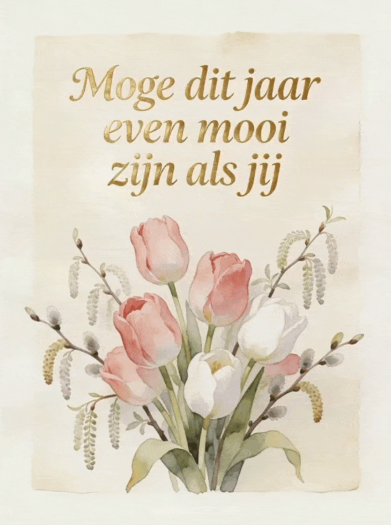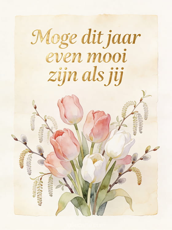 Verras haar met een warme boodschap op haar verjaardag. Elegante gouden handgeschreven letters met een aquarel compositie van roze en witte tulpen op een perkament achtergrond — verfijnd en tijdloos. Ontdek ook een bloemenboeket voor verjaardag vrouw of een gifs verjaardag vrouw.