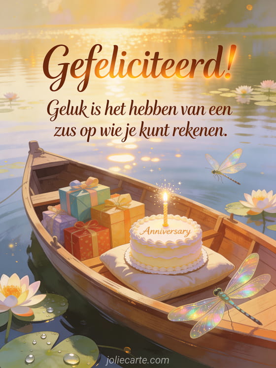 Stuur een ontroerende tekst verjaardagskaart voor je zus met een houten roeiboot vol cadeaus op een rustig meer. Bekijk ook een verjaardagskaart vrouw zus of een verjaardagskaart voor een zus.