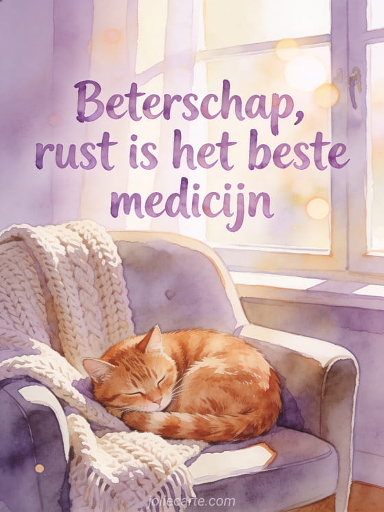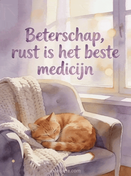 Stuur een gezellige en warme kaart met een slapende roodharige kat in een comfortabele fauteuil bij een raam om iemand te zeggen dat rust het beste medicijn is. Bekijk ook een hart sterkte beterschap, veel sterkte en beterschap of beterschap mijn dochter.