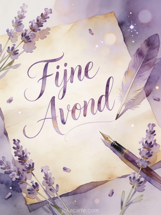 Stuur een prachtige tekst voor fijne avond groet via deze gratis wenskaart. Een elegante ganzenveer pen op perkament met verspreid lavendel, een literaire poëtische sfeer met zachte crème en paarse tinten, perfect voor een hartelijk avondberichtje. Bekijk ook een fijne avond en nacht humor of een afbeelding fijne avond en kusjes.