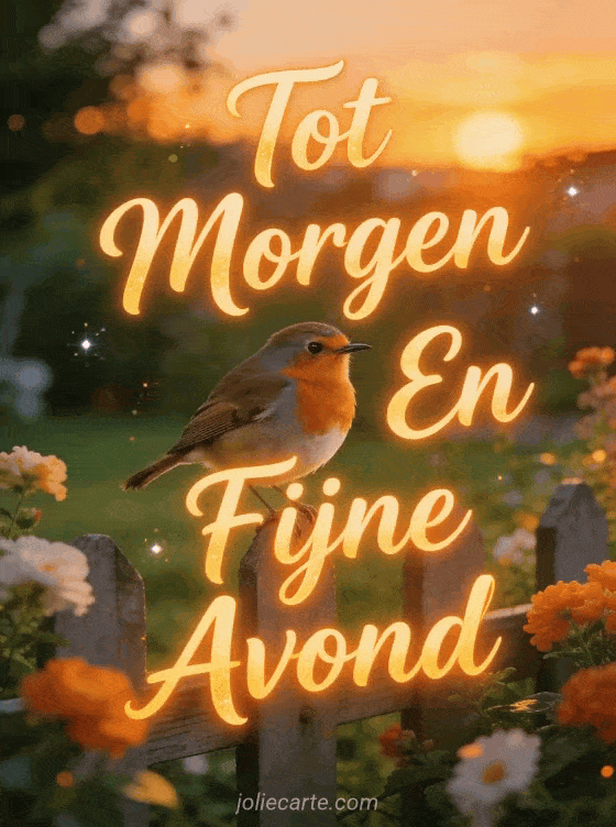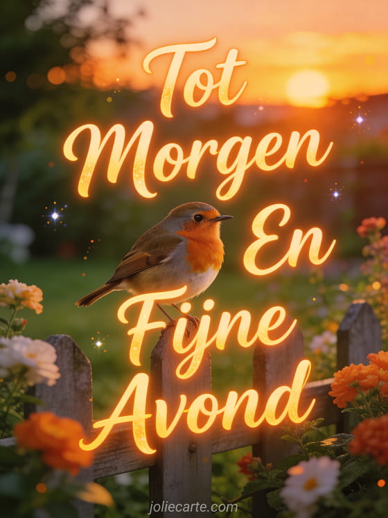 Stuur een vriendelijke tot morgen en fijne avond kaart met een vrolijk roodborstje op een tuinhek bij schemering, verlicht door bloeiende bloemen en zacht avondlicht in een warme uitnodigende sfeer. Ontdek ook een fijne avond kusjes tot morgen kaart of een fijne avond tot morgen in afbeeldingen kaart of een fijne avond tot morgen humor kaart.