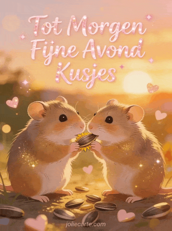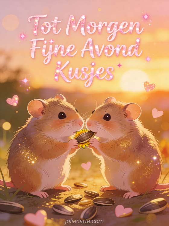 Stuur een liefdevolle tot morgen fijne avond kusjes kaart met twee schattige hamsters die een zonnebloemzaad delen bij een gouden avondzonnetje met verstrooide hartvormige zaadjes. Ontdek ook een fijne avond tot morgen kusjes kaart of een afbeelding fijne avond en tot morgen kaart of een afbeelding fijne avond tot morgen kaart.