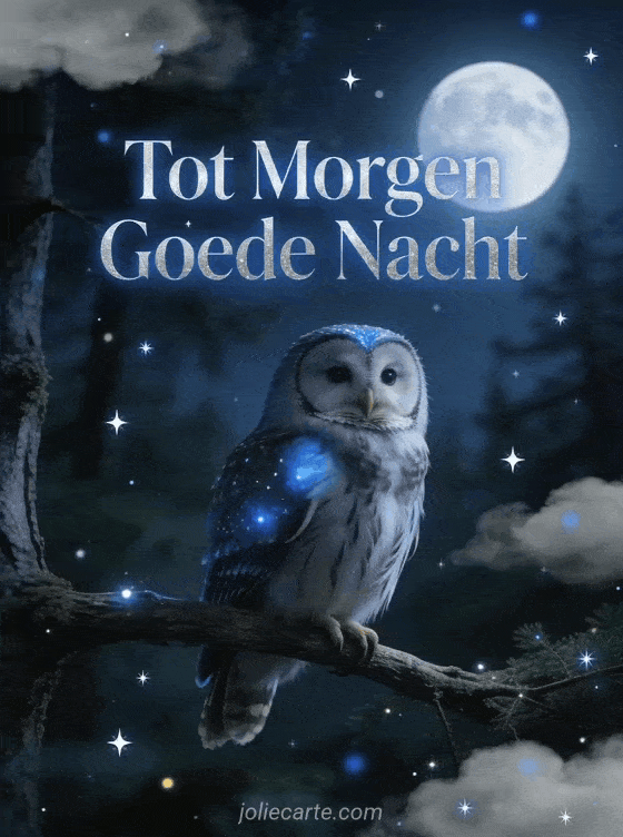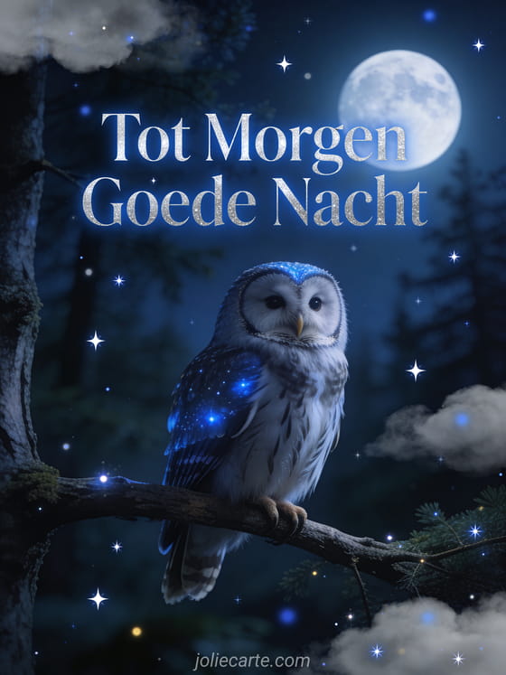 Stuur een kalme tot morgen goede nacht kaart met een vredige uil op een tak onder een volle maan, met fonkelende sterren en zachte wolken in een rustige nachtelijke bossfeer. Ontdek ook een afbeelding goede nacht kusjes tot morgen kaart of een citaat goede nacht tot morgen kaart of een goede nacht tot morgen kusjes kaart.