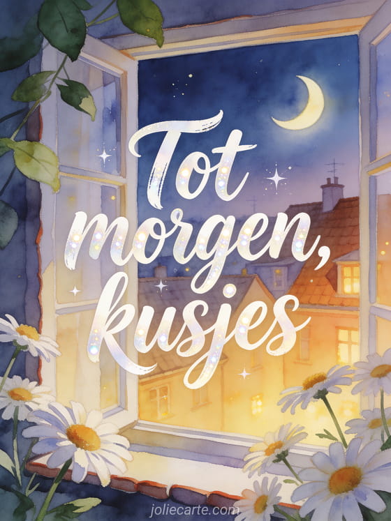 Stuur een lieve boodschap voor tot morgen met aquarel margrieten, een maansikkel en warme lichtjes boven de daken. Ontdek ook een kaart voor sterkte tot morgen, een kaart voor hallo tot morgen of een kaart voor fijne dag tot morgen.