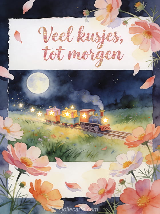 Deel een dromerig afscheid met roségouden aquareltekst, kosmosbloemen die over de rand gaan, een kleine speelgoedtrein met gloeiende stercadeaus door een maanverlichte weide en heldere speelse kleuren. Ontdek ook een kaart voor kusjes en tot morgen afbeelding, een kaart voor bewegende kusjes tot morgen of een kaart voor dikke kusjes tot morgen gif.