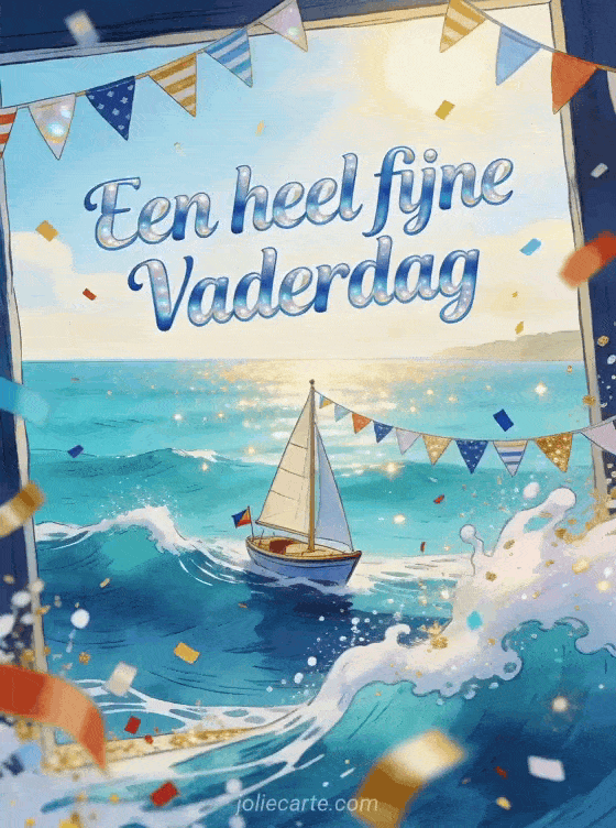 Deel een zonnige vaderdag afbeelding met een kleine zeilboot die over een turquoise baai vaart, feestelijke vlaggetjes, glinsterende golven en vrolijke confetti. Bekijk ook een goedemorgen fijne vaderdag, een overhemd Vaderdagkaart of een Vaderdagkaart.