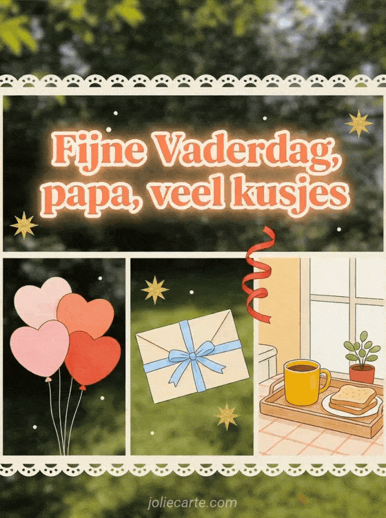 Deel een levendige geïllustreerde Vaderdagkaart met hartvormige ballonnen, een verzegelde envelop met lint en een gezellige ontbijttray met een helder kopje. Het is een zoete manier om papa veel kusjes te sturen. Bekijk ook kaart voor vaderdag papa, fijne vaderdag voor mijn zoon en alle papa's of een voorbeeld vaderdagkaart.