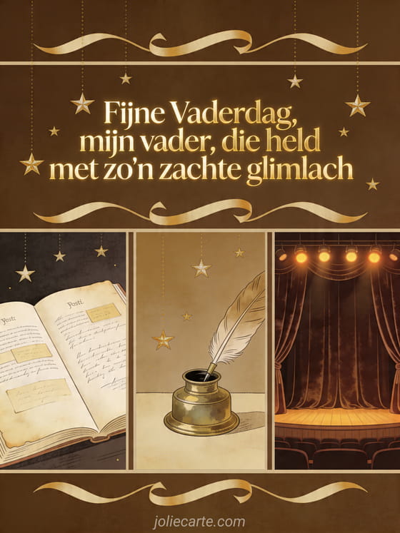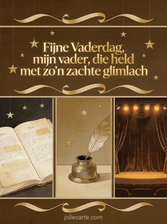 Stuur een Vaderdag gedicht met verfijnde sepialetters en een vintage collage met open poëzieboek, messing inktpot met veer en fluwelen theatergordijn onder warme podiumlichten. Ontdek ook tekening fijne vaderdag papa, gedicht fijne vaderdag papa vriendelijkheid en tederheid of een vaderdagkaart papa.