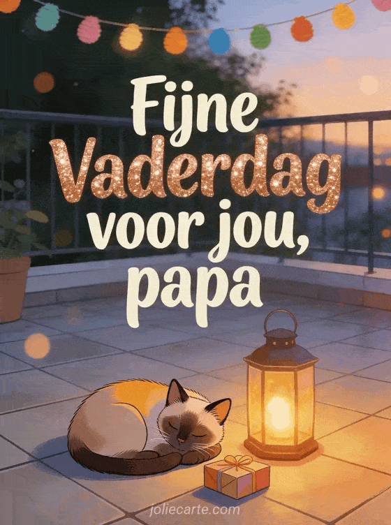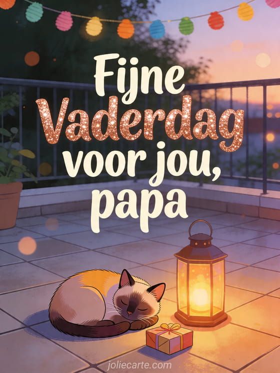 Stuur papa een vrolijke geïllustreerde kaart met een Siamese kat naast een klein cadeau en een lichtgevende lantaarn op een betegeld terras. De warme avondkleuren maken deze Vaderdaggroet lief en feestelijk. Bekijk ook vaderdag bloemen, mijn lief fijne Vaderdag of een gratis kaart voor vaderdag.