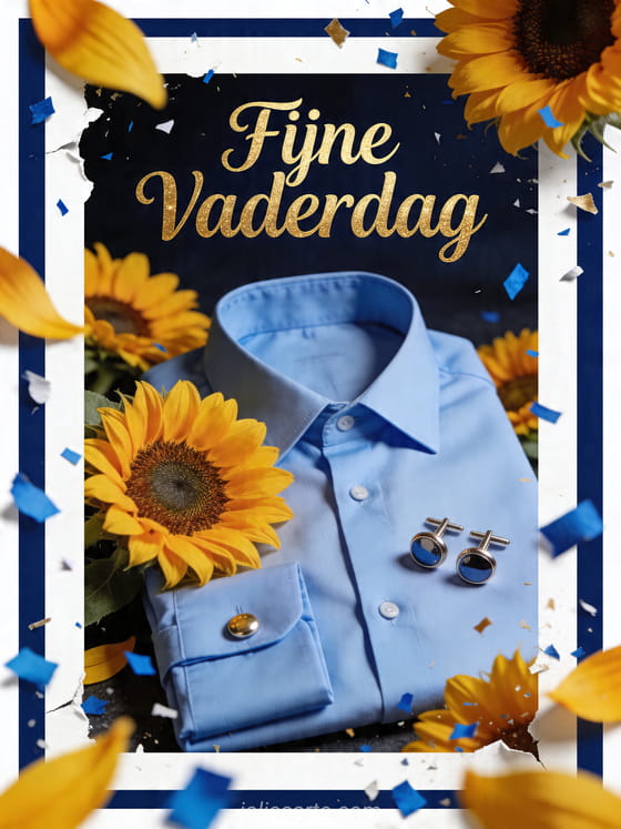 Stuur een elegante Vaderdagkaart met overhemd, een fotorealistisch gevouwen hemelsblauw overhemd, gepolijste manchetknopen, zonnebloemen en frisse blauwe confetti in warm studiolicht. Ontdek ook een originele Vaderdagkaart, kaarten voor vaderdag of fijne moederdag mama en fijne vaderdag papa.