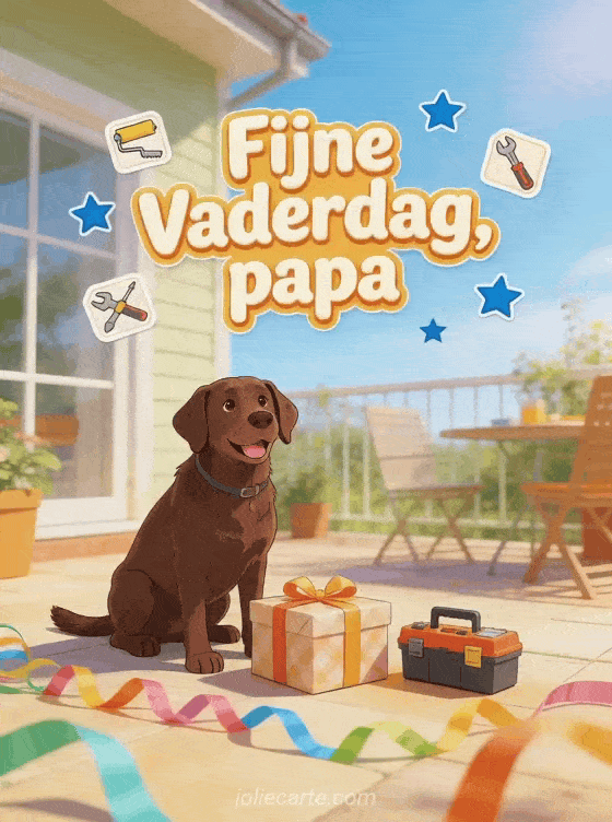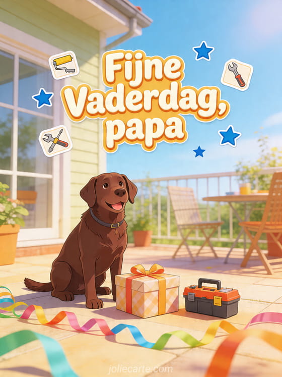Stuur een vaderdagkaart papa met speelse crèmekleurige letters, gereedschapsstickers, blauwe sterren, een vrolijke chocoladebruine labrador naast een ingepakt cadeau, een kleine gereedschapskist en kleurrijke serpentines op een helder terras. Bekijk ook een gratis Vaderdagkaart, een fijne vaderdag papa afbeelding of liefdevolle woorden voor vaderdag.