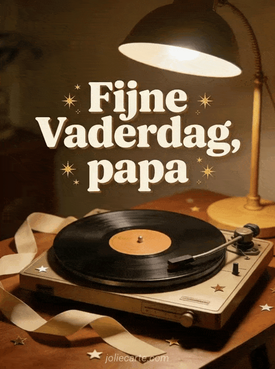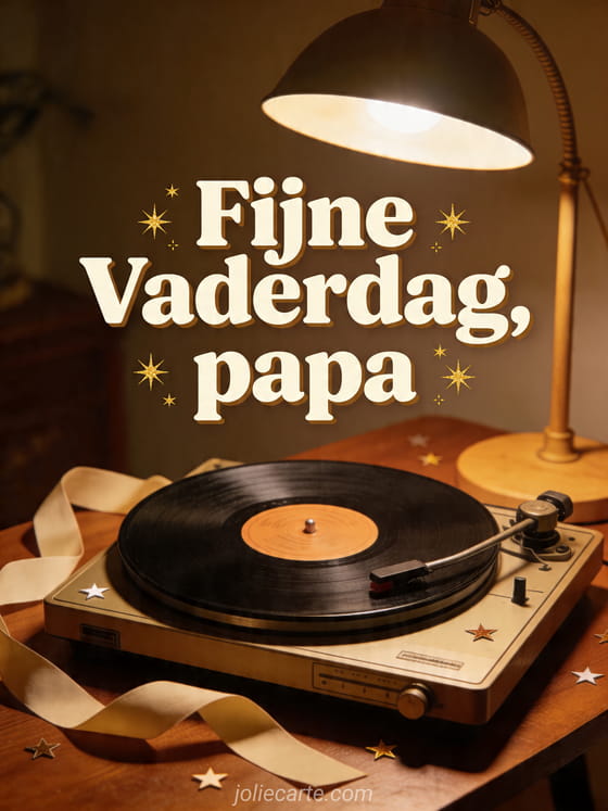 Deel een gezellige Vaderdagkaart met een vintage platenspeler, vinylplaat, warm lamplicht, gevouwen lint en kleine sterrenconfetti op een notenhouten tafel. Dit nostalgische ontwerp past perfect bij een papa die van muziek houdt. Bekijk ook prettige vaderdag, fijne vaderdag voor alle papa's ter wereld of beeld Vaderdag.