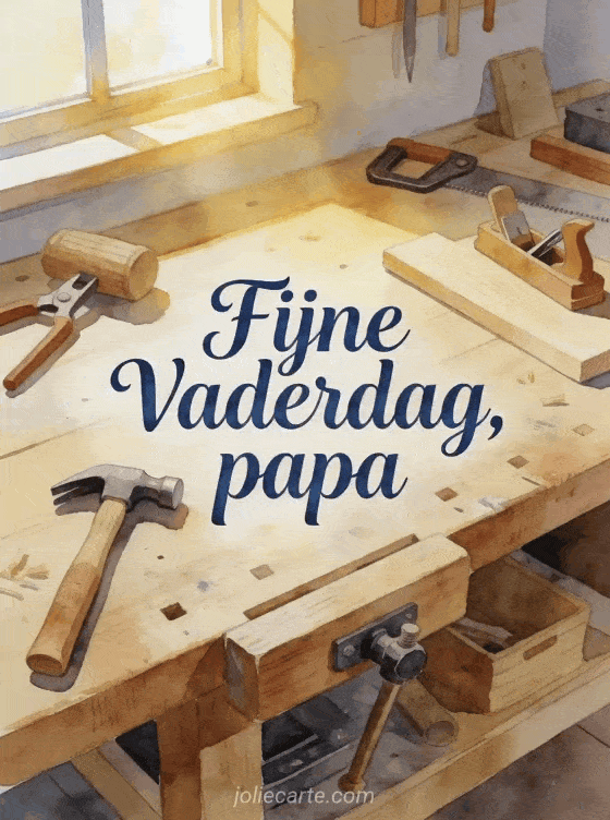 Stuur een vaderdagkaart voor papa met een elegante handgeschreven boodschap en een gezellige kluswerkplaats vol houten gereedschap, een werkbank en gouden middaglicht. Ontdek ook een gratis afbeelding vaderdag, een fijne Vaderdag kaart of een gratis fijne Vaderdag papa afbeelding.