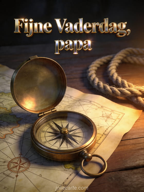 Stuur Vaderdagkaarten met metallic gouden letters, een oud messing kompas open op een vintage zeekaart en een scheepstouw op een donkere houten tafel. Ontdek ook een Vaderdagkaart gratis, vaderdag voor mijn zoon of een Vaderdagkaart PS.