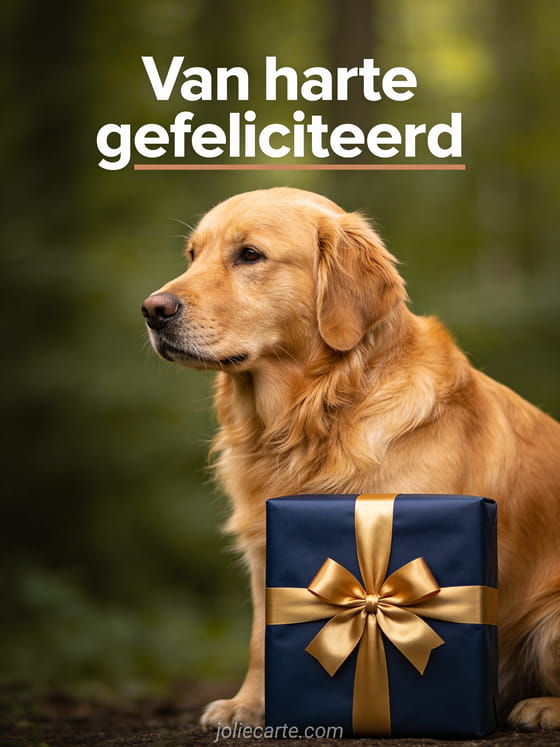 Een prachtige golden retriever met goudkleurige vacht zit waardig voor een cadeautje in marineblauw papier met een gouden strik. Bekijk ook verjaardagskaart man gratis humor of tekst verjaardag man.
