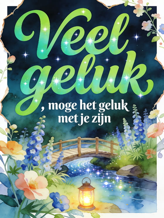 Wens veel geluk met een avontuurlijke aquarelscene: een kleine houten brug over een sprankelende beek, ridderspoor en een lichtgevende lantaarn. Je kunt ook een tekst om succes te wensen voor een examen, een veel succes bericht voor een wedstrijd of een veel succes afbeelding met een paard sturen.