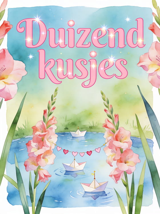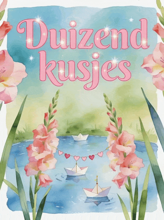 Stuur een tedere duizend kusjes groet met papieren bootjes die hartslingers over een aquarel vijver dragen tussen hoge gladiolen. Ontdek ook een kusjes hond gif, een veel kusjes kat gif of een afbeelding vol kusjes.