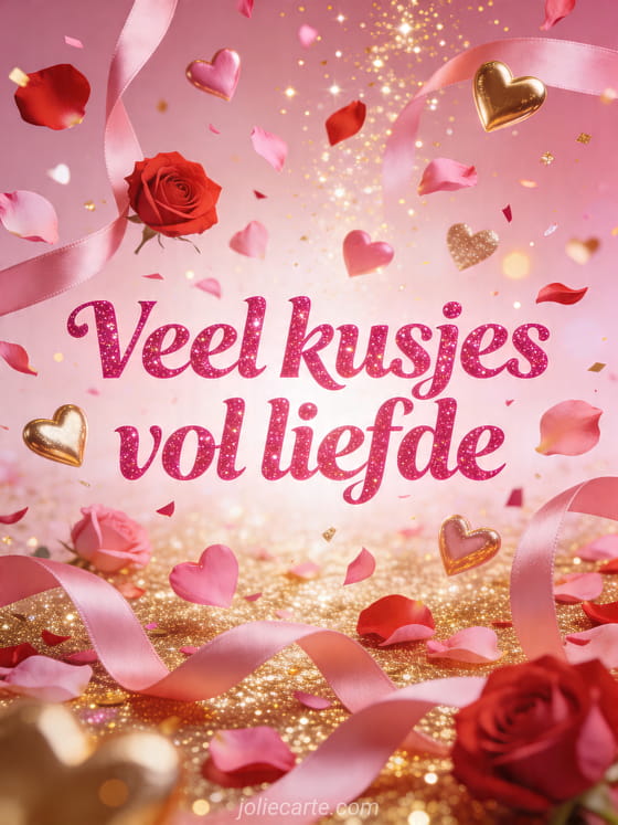 Stuur een levendige romantische boodschap met deze gratis kaart met liefdeskusjes vol rozenblaadjes, vliegende hartjes en glinsterende linten. Ontdek ook zoete dromen goedenacht kusjes ik hou van je, duizend kusjes uit het hart of stel kusjes in het water.