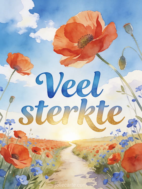 Stuur een frisse aquarelkaart met een landweg omzoomd met klaprozen en korenbloemen en een lichtend horizon om een zieke persoon veel sterkte te wensen. Bekijk ook een succes wensen operatie, sterkte bij operatie of virtuele kaart veel sterkte operatie.