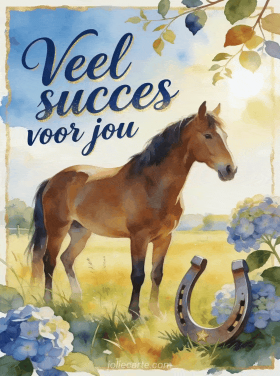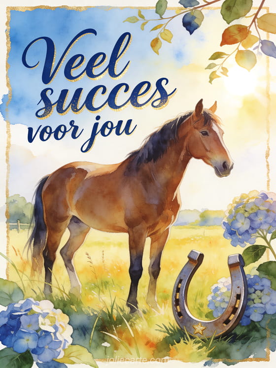 Stuur veel succes voor jou met diepblauwe kalligrafie, een kastanjebruin paard in een lichte weide, een gelukshoefijzer en hortensia's over de rand. Ontdek ook succes aanmoediging gif, een gratis veel succes kaart of veel succes kaart.