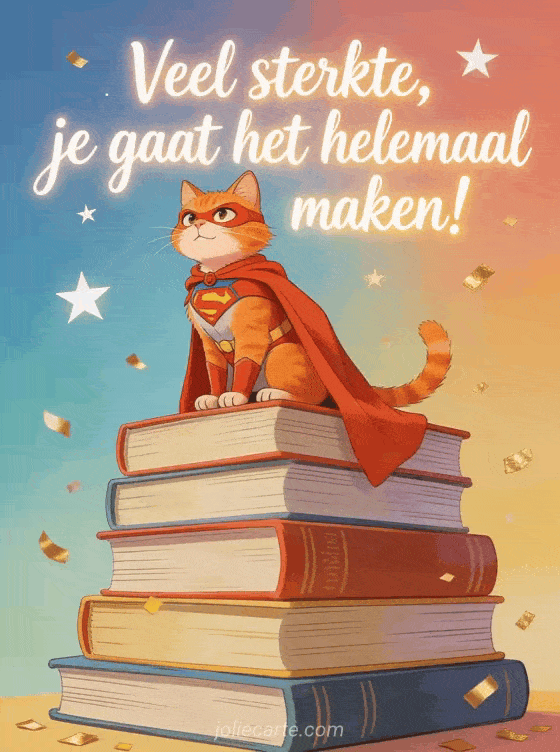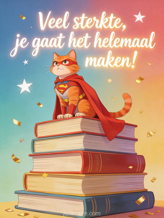 Stuur een grappige en bemoedigende kaart met een roodharige kat in superheldenkostuum op een stapel boeken om iemand te motiveren voor zijn examen. Bekijk ook een afbeelding veel succes voor je examen, gif veel succes examen of veel succes voor je wedstrijd.