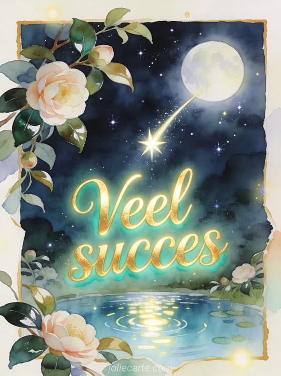 Deel een veel succes wens met een vallende ster boven een heldere maanverlichte vijver, felle weerspiegelingen, camelia's en glanzende bladeren. Ontdek ook een veel succes voor morgen afbeelding, wensen voor veel succes of gratis veel succes afbeeldingen.