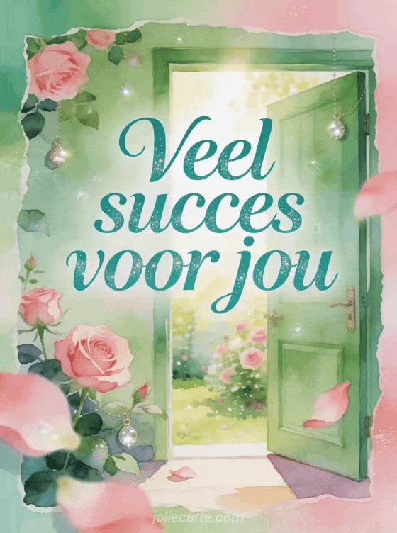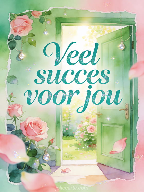 Stuur veel succes voor jou met elegante jadekleurige letters, een groene geluksdeur naar een stralende tuin, rozen en kleine glanzende geluksbrengers. Ontdek ook veel succes met je examen tekst, gratis geanimeerde succes gifs of een bericht om succes te wensen voor een examen.
