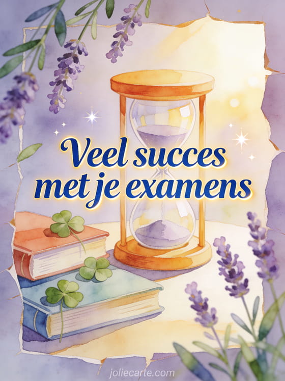 Wens veel succes met examens met een heldere zandloper, gesloten studieboeken, geluksklavers en lavendelstelen in rustig aquarelzonlicht. Je kunt ook een veel succes examen geanimeerde gifs gif, virtuele kaarten succes of een succes klavertjevier afbeelding sturen.
