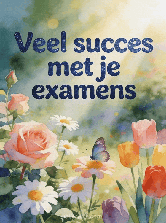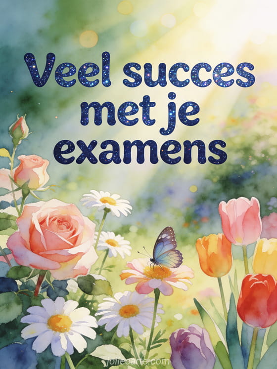 Stuur een mooie aquarelkaart met een lentebloementuin vol rozen, madeliefjes en tulpen om iemand succes te wensen voor zijn examens. Bekijk ook een veel succes herhaling, veel succes examen humor of een afbeelding veel succes voor je examen.