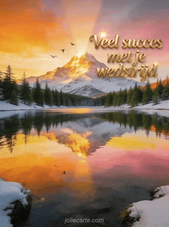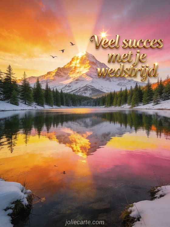 Stuur een prachtige motiverende kaart met een besneeuwde berg bij zonsopgang om iemand veel succes te wensen voor zijn wedstrijd. Bekijk ook een veel succes voor je examens of een veel succes wensen voor de studies.