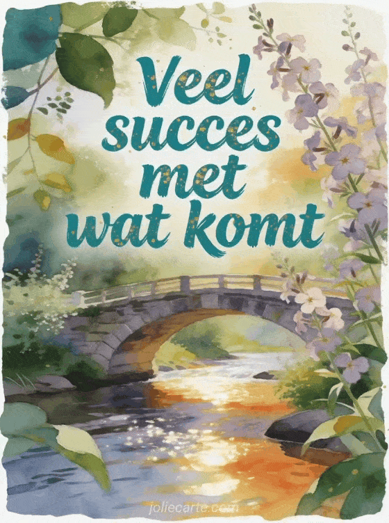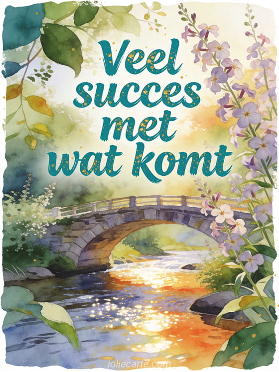 Stuur veel succes voor wat komt afbeelding met petrolkleurige letters, een sierlijke stenen brug, een sprankelende beek, vlambloemen en groene bladeren. Bekijk ook een succes kat afbeelding, een gratis geanimeerde veel succes gif of een veel succes wedstrijd afbeelding.