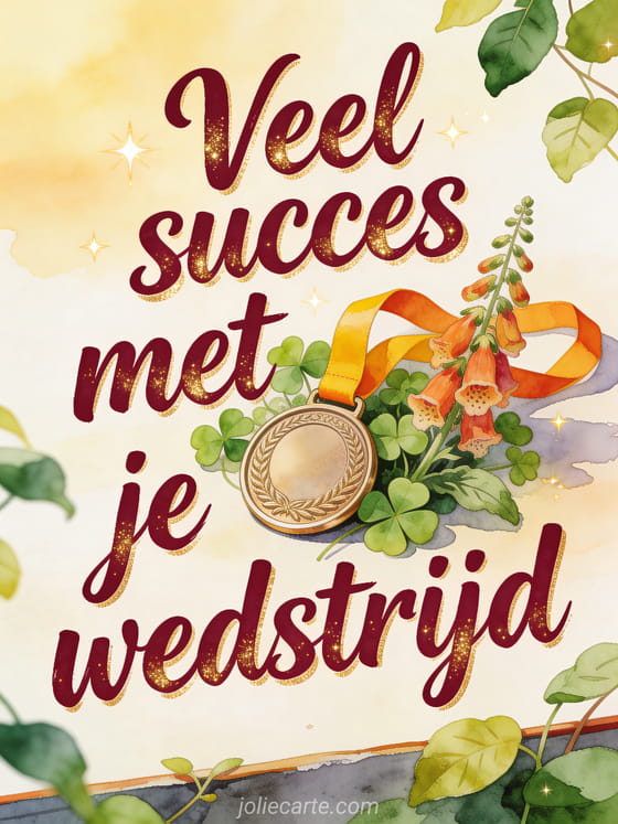 Deel een motiverende veel succes kaart met een heldere medaille, lint, geluksklavers, vingerhoedskruid en frisse bladeren in een feestelijke aquarelscène. Je kunt ook een veel succes met je examens gif, een veel succes examen geanimeerde gifs gif of virtuele kaarten succes sturen.