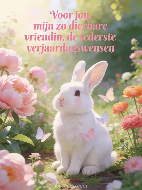 Een schattig wit konijntje in een tuin vol pioenrozen en ranonkels met pastelkleurige vlinders voor een tedere verjaardagswens. Bekijk ook vriendschap gefeliciteerd vriendin of tekst verjaardag vriendin.