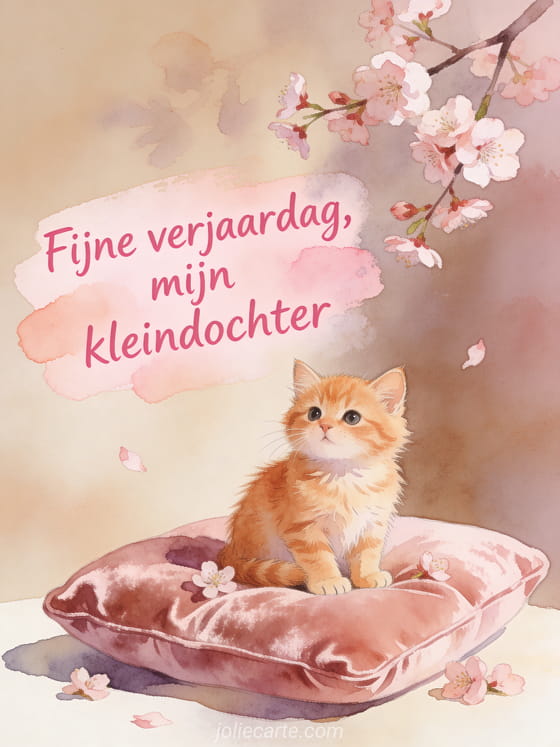 Stuur je kleindochter een zachte verjaardagsgroet met een schattig rood katje op een roze fluwelen kussen, omringd door kleine kersenbloesems. Ontdek ook verjaardag kleindochter afbeelding gif, verjaardagswoordje kleindochter of fijne verjaardag kleindochter afbeelding.