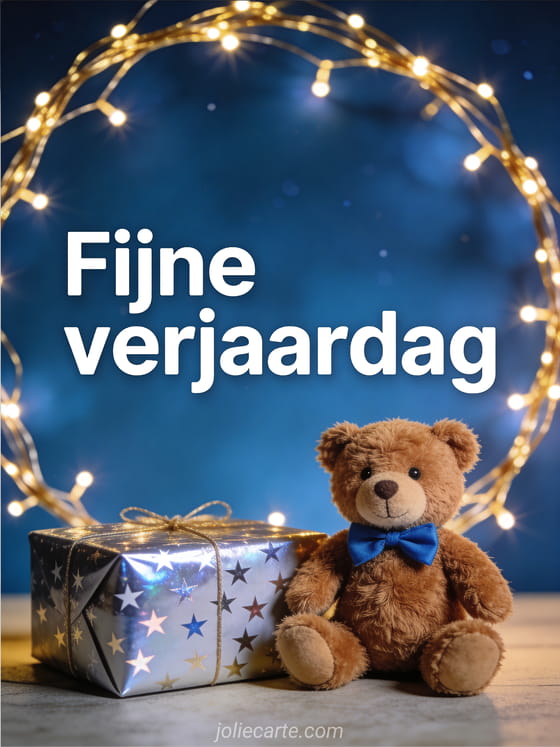Stuur een zachte en magische verjaardagsgroet met moderne witte letters op een nachtblauwe achtergrond, een kleine bruine teddybeer met blauwe vlinderdas, een cadeau met sterrenpapier en warme gouden slingerlichtjes.