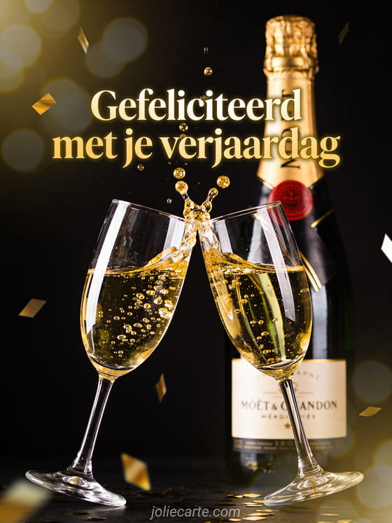 Proost op zijn verjaardag met deze elegante kaart. Twee kristallen champagne glazen klinken met gouden spatten, een vintage champagnefles en gouden confettis op een diepe zwarte achtergrond — pure klasse. Ontdek ook een foto gefeliciteerd verjaardag man of een gefeliciteerd verjaardag man humor gratis.