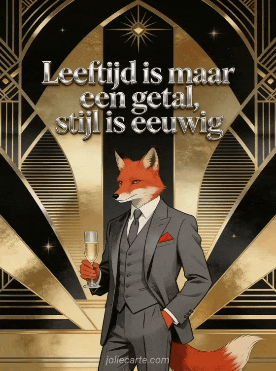 Een elegante rode vos in driedelig antracietgrijs pak met rode pochet houdt een glas champagne vast in een art deco interieur. Bekijk ook afbeeldingen gefeliciteerd verjaardag man humor of gif verjaardag man humor.