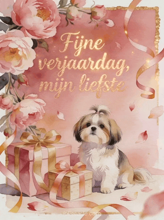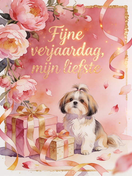 Vier je liefste met een warme aquarel verjaardagskaart met een charmante shih tzu naast cadeaus met linten onder neerhangende pioenrozen. Bloemblaadjes en slingers lopen over de rand voor een feestelijke romantische gloed. Ontdek ook een fijne verjaardag kaart mijn liefde, een fijne verjaardag mijn liefste afbeelding of een geanimeerde fijne verjaardag mijn liefste gif.