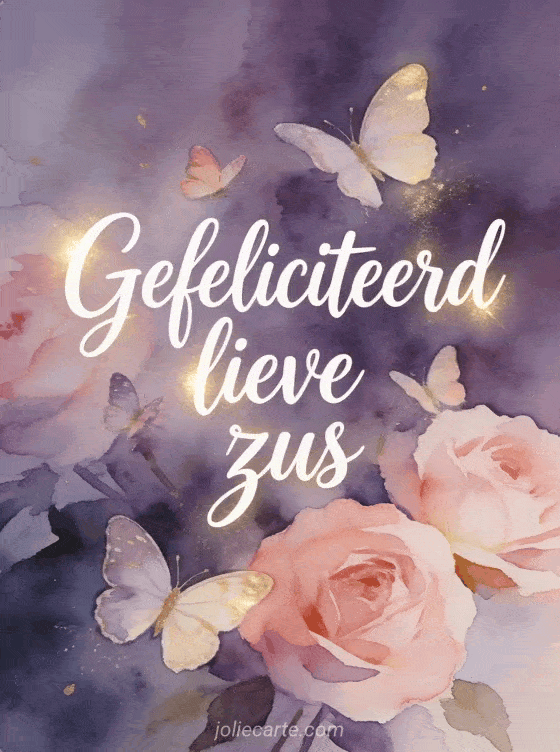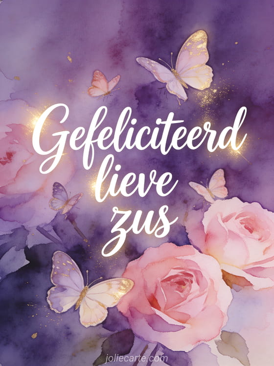 Deel deze poëtische kaart voor je zus met fijne vlinders, paarse aquareltinten en gouden lichttoetsen. Bekijk ook fijne verjaardag mijn zielszus tekst, fijne verjaardag grote zus en verjaardagsbrief zus.