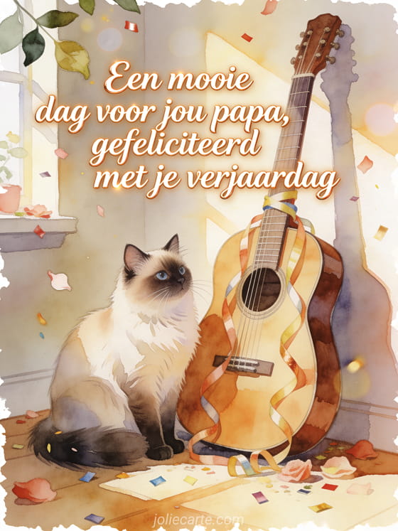 Deel een verjaardagstekening voor papa met een Birmaan kat naast een akoestische gitaar met verjaardagslinten in een zonnige werkplaats. Kies ook voor je dochter gefeliciteerd met je verjaardag papa van je dochter, brief voor papa's verjaardag of fijne verjaardag mijn lieve papa.