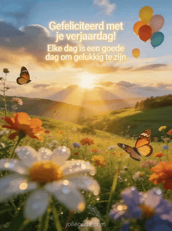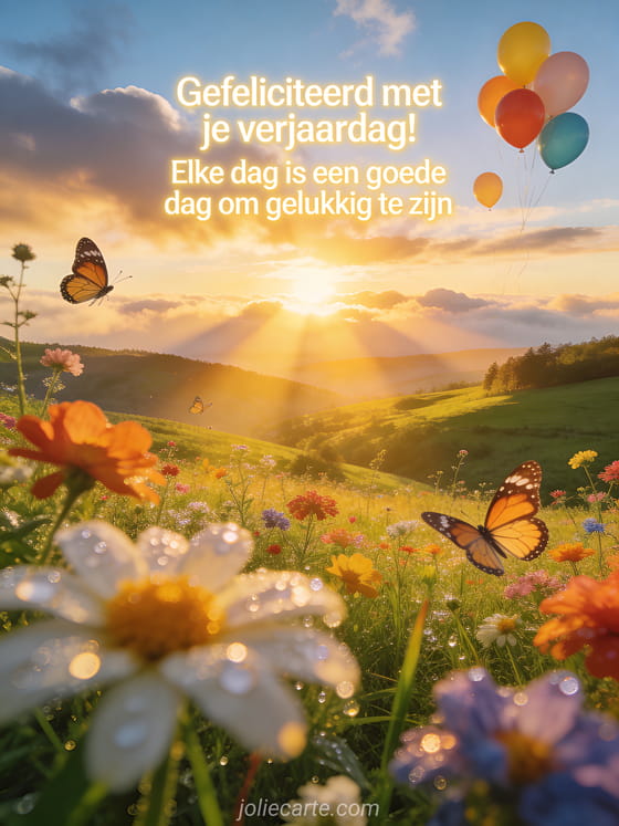 Stuur een stralende gratis verjaardagskaart met een inspirerende tekst en een spectaculaire zonsopgang over een groene vallei. Ontdek ook bericht fijne verjaardag, kort berichtje voor een verjaardag of bericht gelukkige verjaardag.